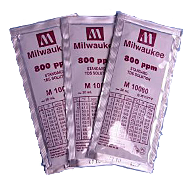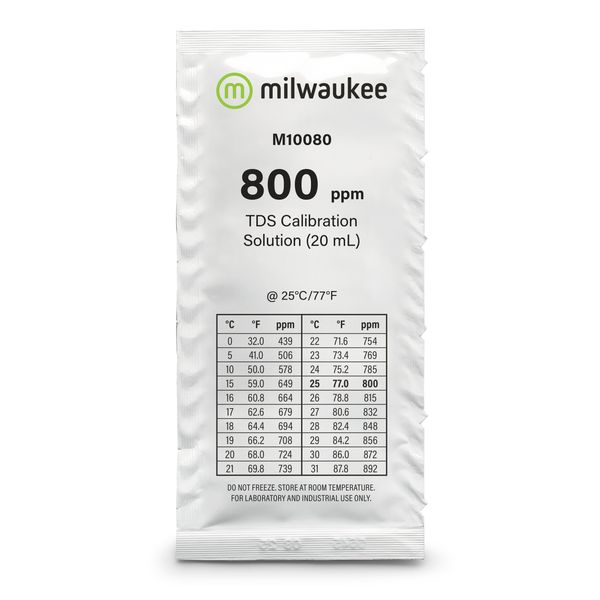 | Three, 20 mL sachets of 800 ppm TDS calibration solution. This solution is used to calibrate the TDS meter Milwaukees conductivity calibration solutions are made from established formulas and are traceable to a NIST standard reference solution. This is an aqueous solution of sodium chloride. These 20 mL sachets are ideal for infrequent calibrations. Printed on each sachet is a conductivity temperature correlation chart as well as the lot # and expiration date. |