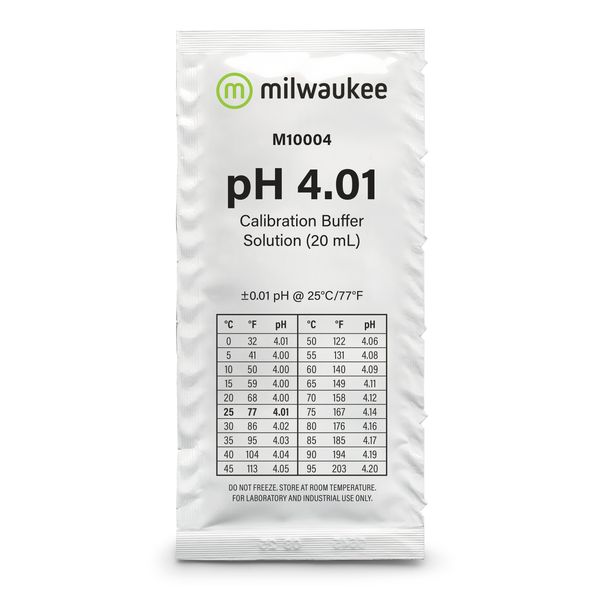 | Three 20 mL sachets of pH 4.01 calibrating buffer solution. Milwaukee buffer solutions are made from established formulas and are standardized with a pH meter that is calibrated to the NIST primary standard buffer solutions These 20 mL sachets are ideal for infrequent calibrations. Printed on each sachet is a pH / Temperature chart as well as the lot # and expiration date. This buffer is an aqueous solution of hydrogen phthalate. |